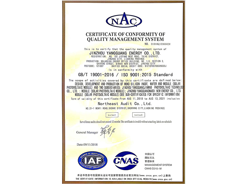 品質(zhì)管理體系認(rèn)証証明書(中國語)