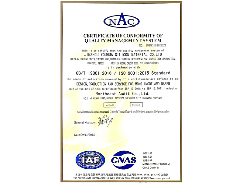 品質(zhì)管理體系認(rèn)証証明書(中國語)