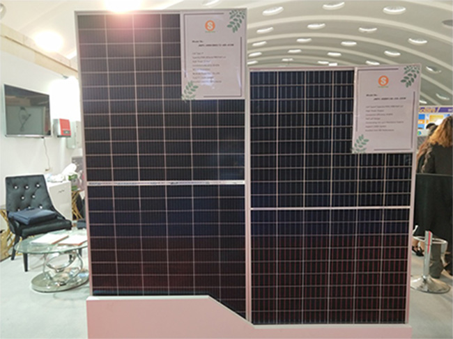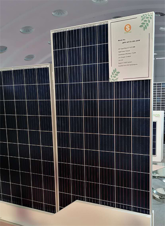 此次展會,陽光能源品牌展出三款組件,分別為單晶雙玻半片9BB-410W組件、單晶常規(guī)半片5BB-330W組件、多晶72片330W組件和多晶60片275W組件,其中,多晶275W和330W組件由于性價比高,在當?shù)厮孟到y(tǒng)和農(nóng)業(yè)項目中應用廣泛,引起熱銷浪潮。另外,單晶雙玻半片9BB-410W組件也受到很多訪客的關(guān)注和咨詢。