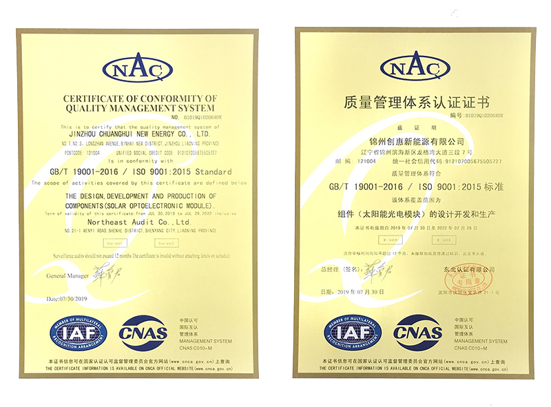 2019年7月30日,錦州陽光能源有限公司全資子公司錦州創(chuàng)惠新能源有限公司喜獲品質(zhì)體系認證證書